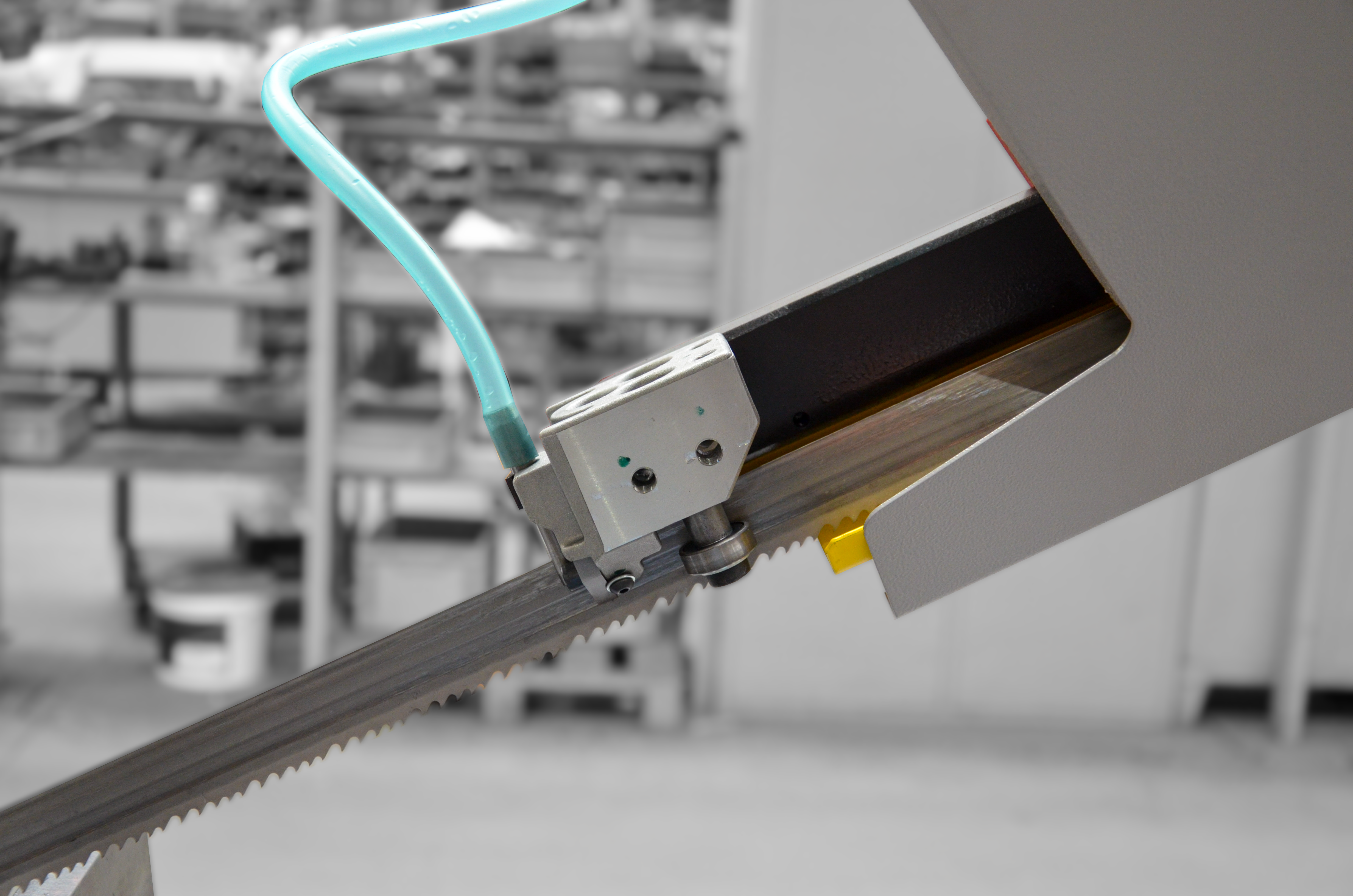 Precyzyjna prowadnica taśmy wykonana z utwardzanego metalu, przegub ramienia w fabrycznie obciążonych łożyskach stożkowych oraz synchronicznie działająca szczotka do usuwania ścinek zapewniają najwyższą wydajność operacyjną oraz utrzymują taśmę w dobrym stanie technicznym przez długi okres czas.