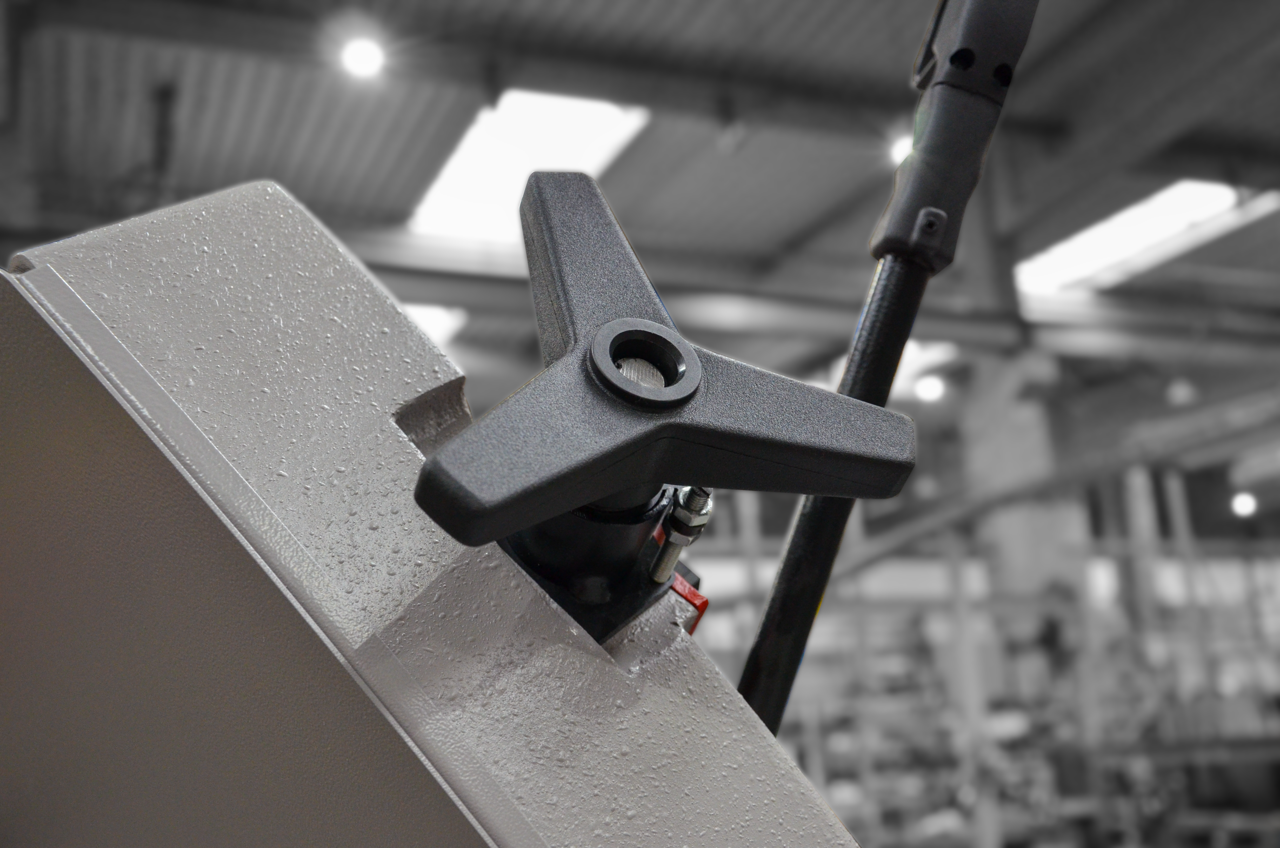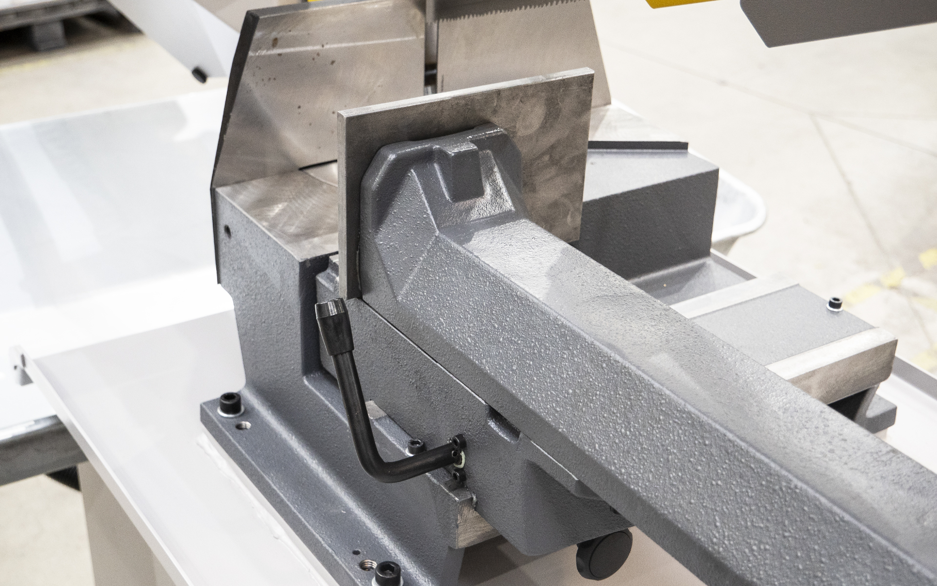 Urządzenie wyposażone jest w dwustronne ramię o zakresie obrotu 5°- 0/90°- 60° (przy stabilnym położeniu ściskanego materiału) oraz solidne imadło.