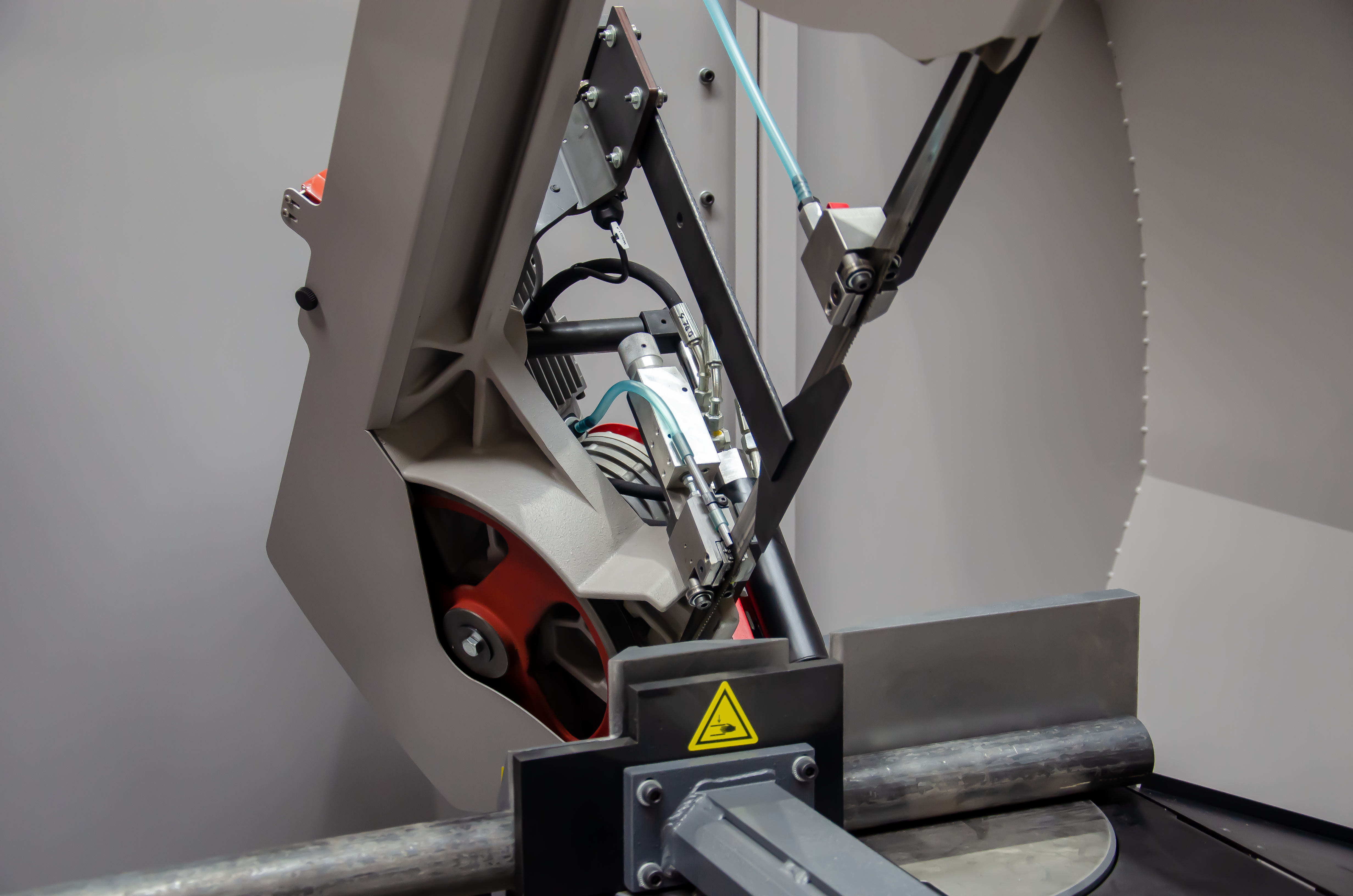 Ramię o dużej wytrzymałości jest wykonane z żeliwa szarego, co oznacza lepsze pochłanianie drgań podczas cięcia. Doskonała wydajność wycinania wynika z następujących cech: precyzyjna prowadnica taśmy piły wykonana z twardego stopu, połączenie osadzone w łożyskach stożkowych z wstępnym zaciskiem, taśma o wysokości 27 mm oraz szczotka do usuwania opiłków z synchronicznym przesuwem.