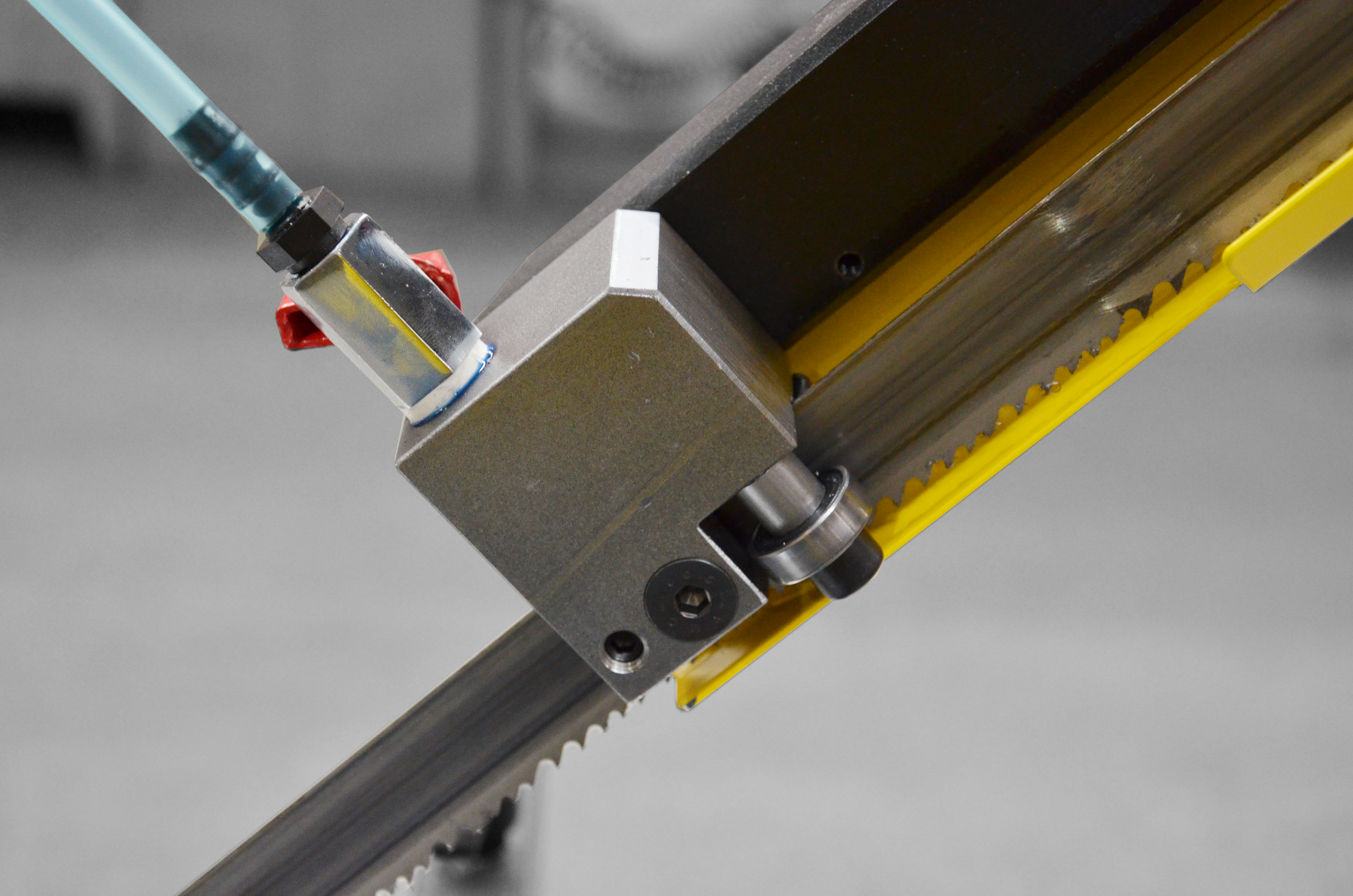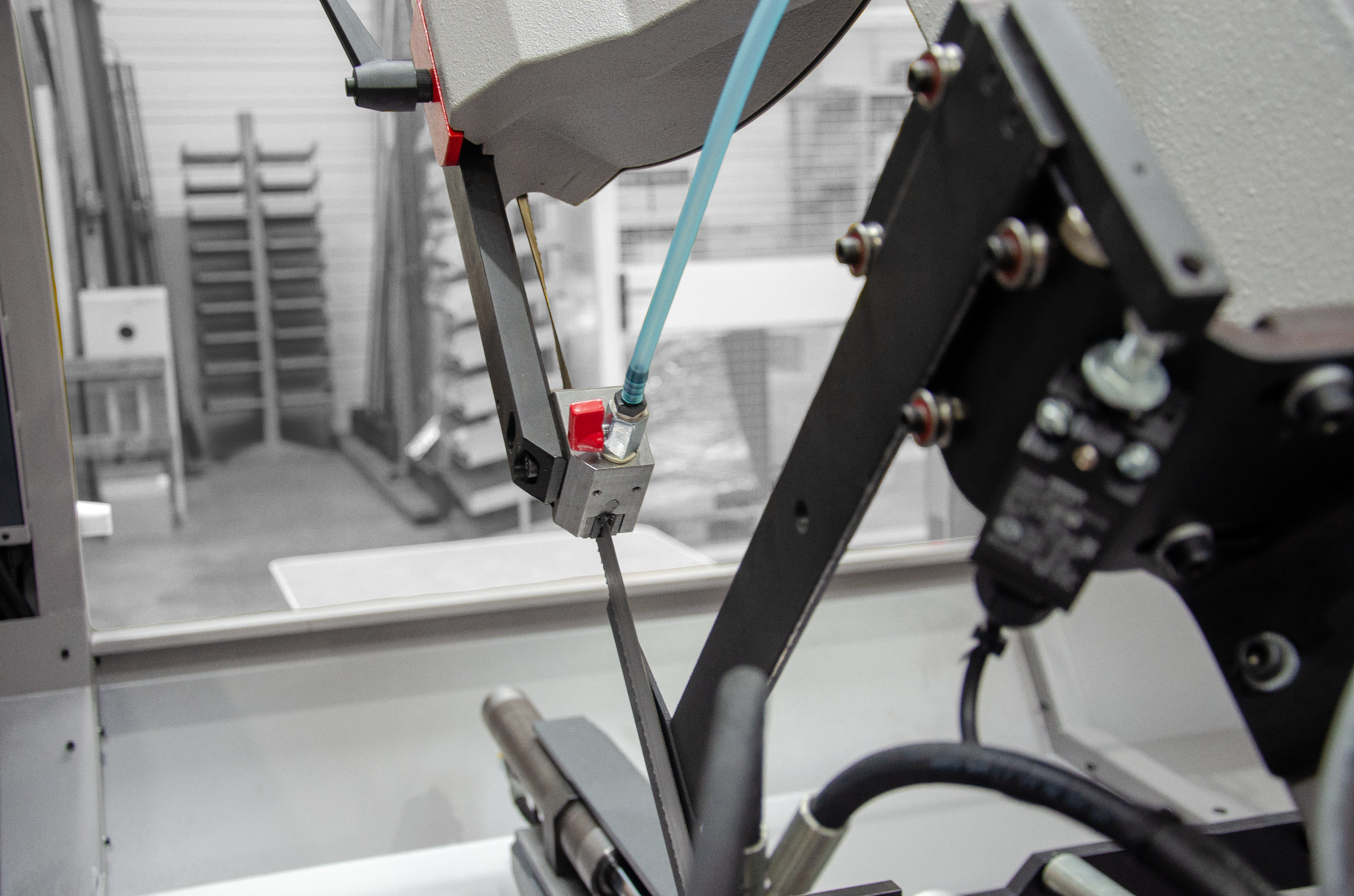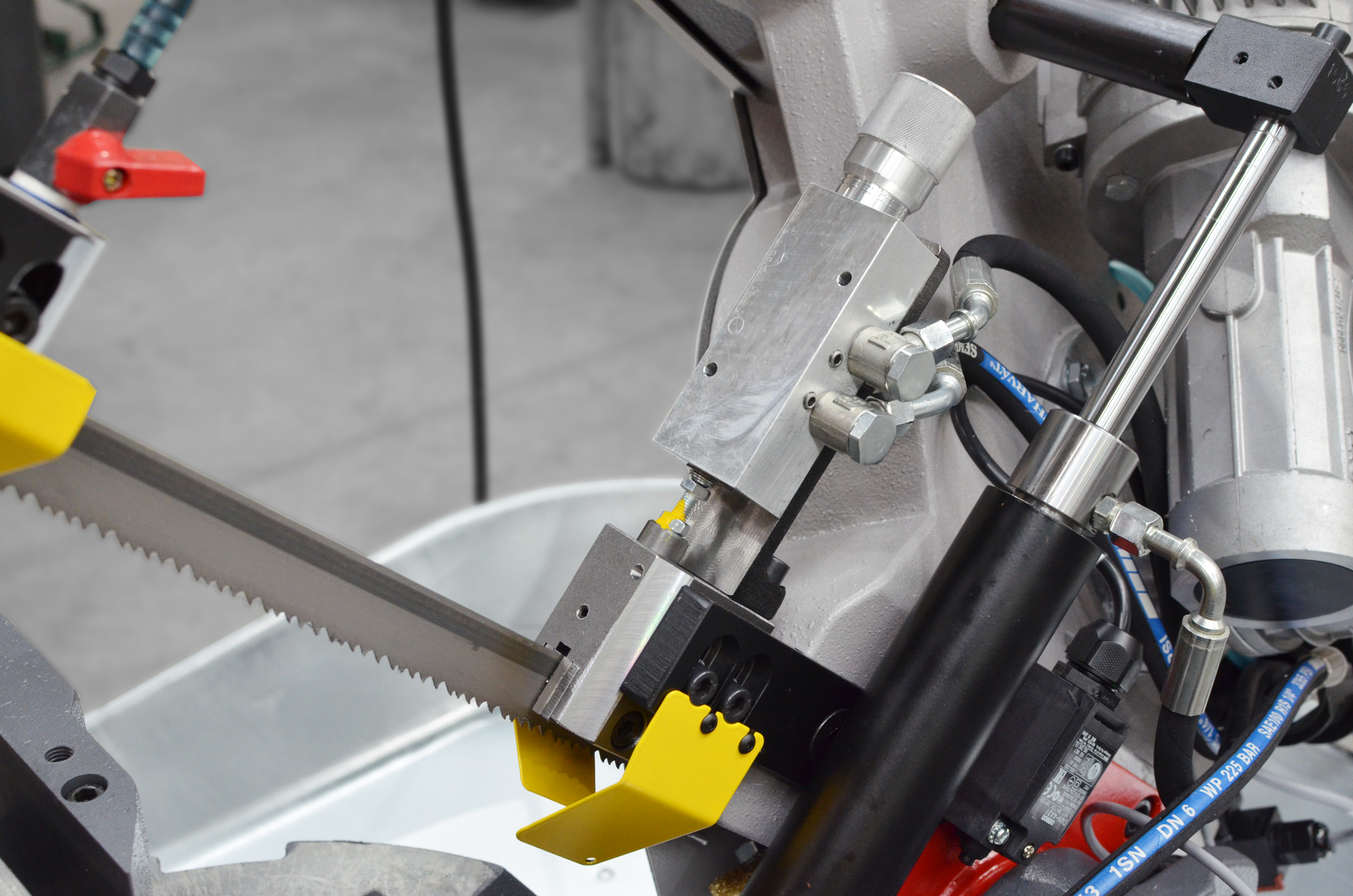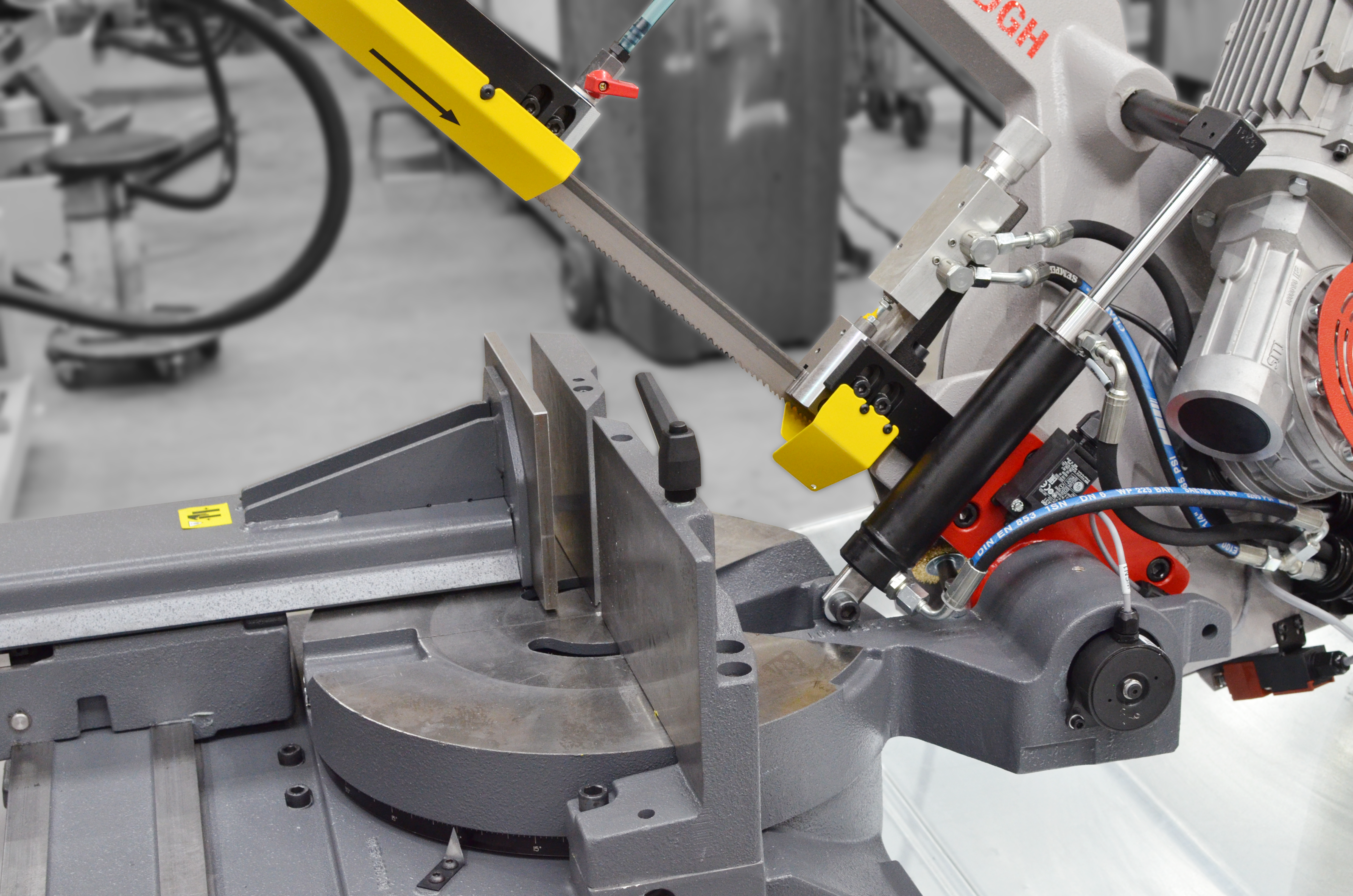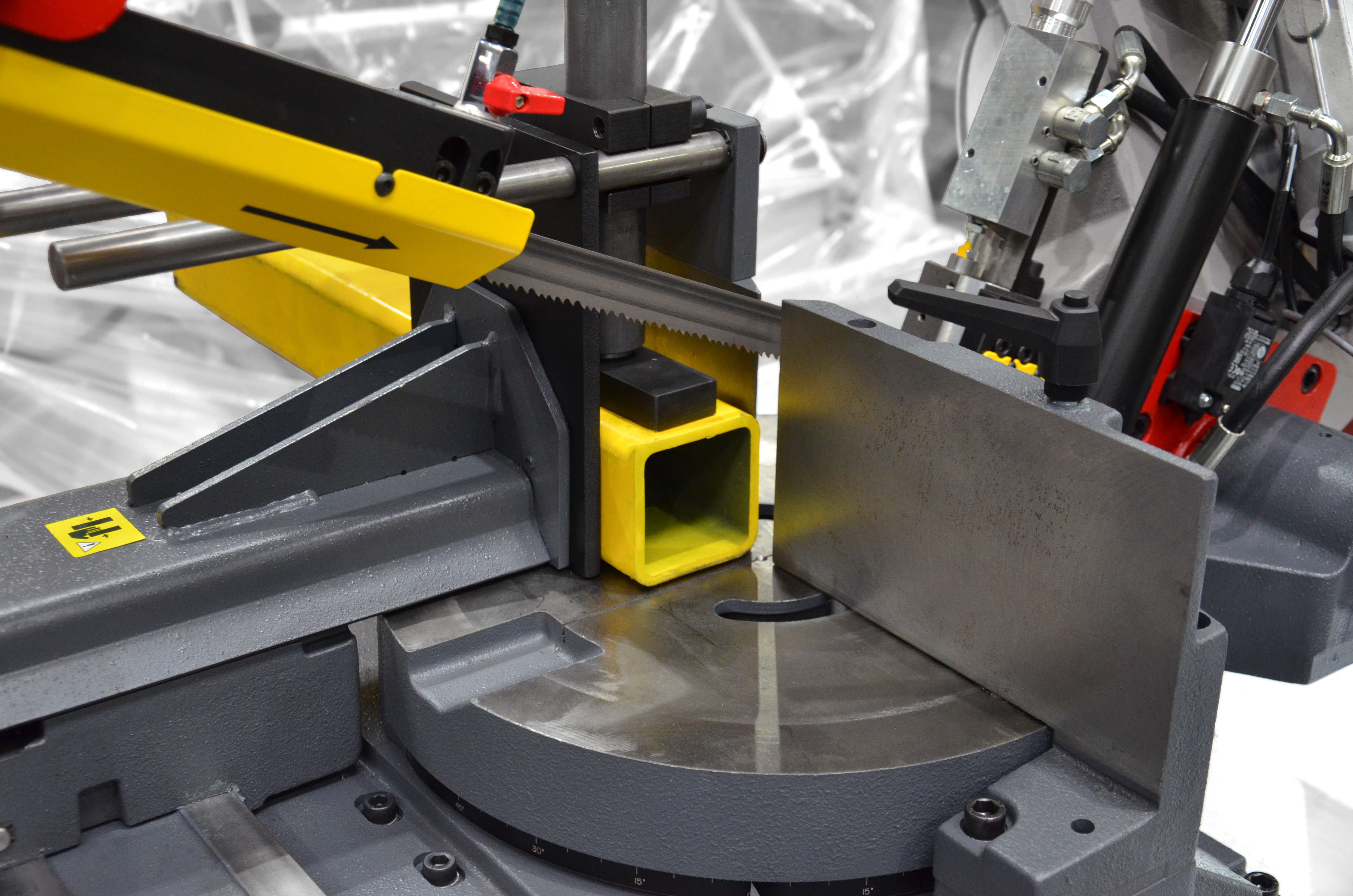 Ramię o dużej wytrzymałości jest wykonane z żeliwa szarego, co oznacza lepsze pochłanianie drgań podczas cięcia w porównaniu z ramieniem spawanym. Doskonała wydajność produkcji maszyny wynika z następujących cech: precyzyjna prowadnica taśmy piły wykonana z twardego stopu, połączenie osadzone w łożyskach stożkowych z wstępnym zaciskiem, taśma o wysokości 27 mm oraz szczotka do usuwania opiłków z synchronicznym przesuwem.