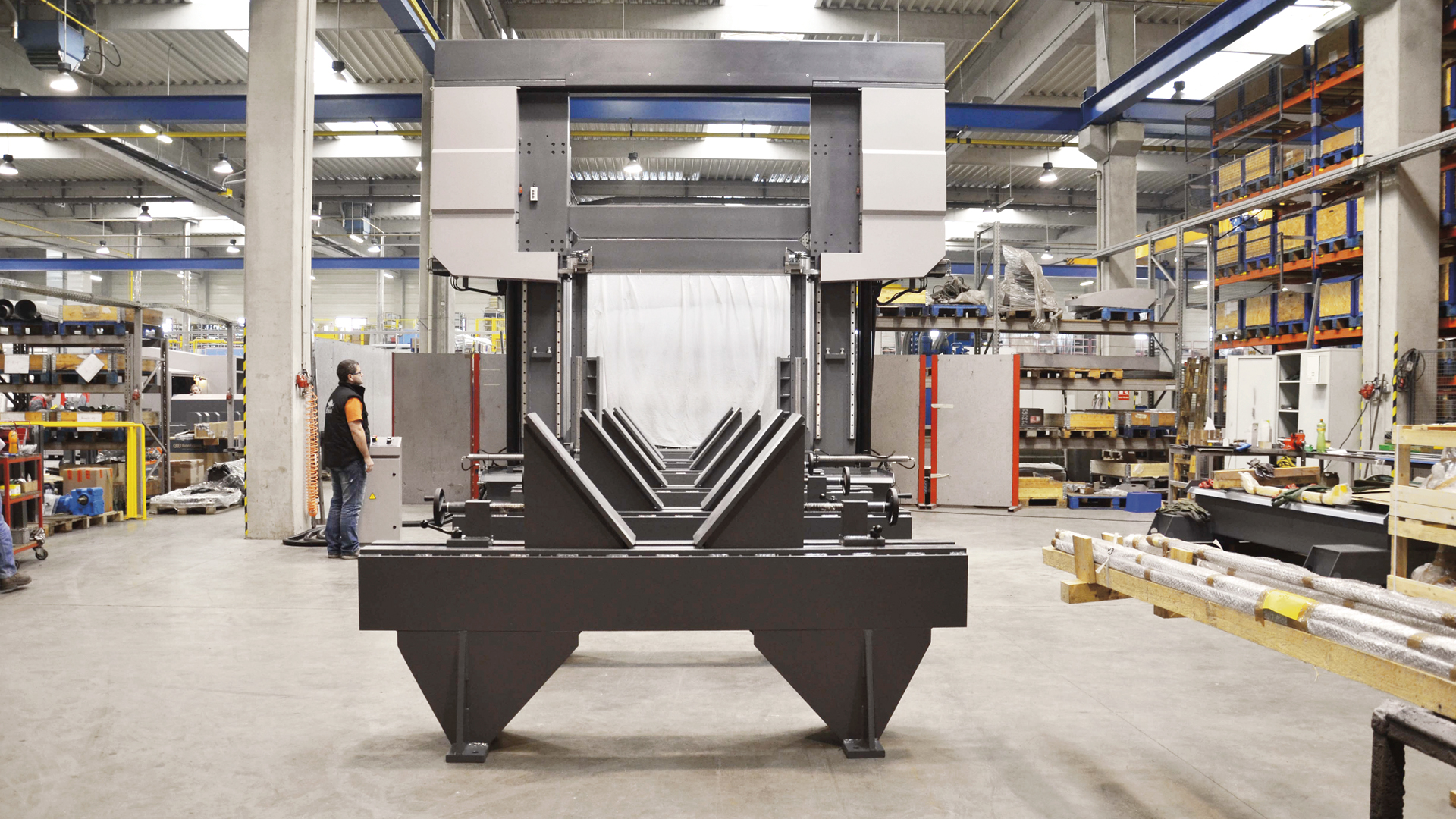 Rama jest osadzona na dwóch solidnych kolumnach w rolujących, linearnych prowadnicach. Kolumny są ściśle powiązane zarówno na górze jak i na dole. Pionowy ruch ramy odbywa się przez dwa hydrauliczne, suwowe cylindry. Dwie kolumny są wypełnione polimerobetonem dla lepszej absorpcji drgań i lepszego działania urządzenia.