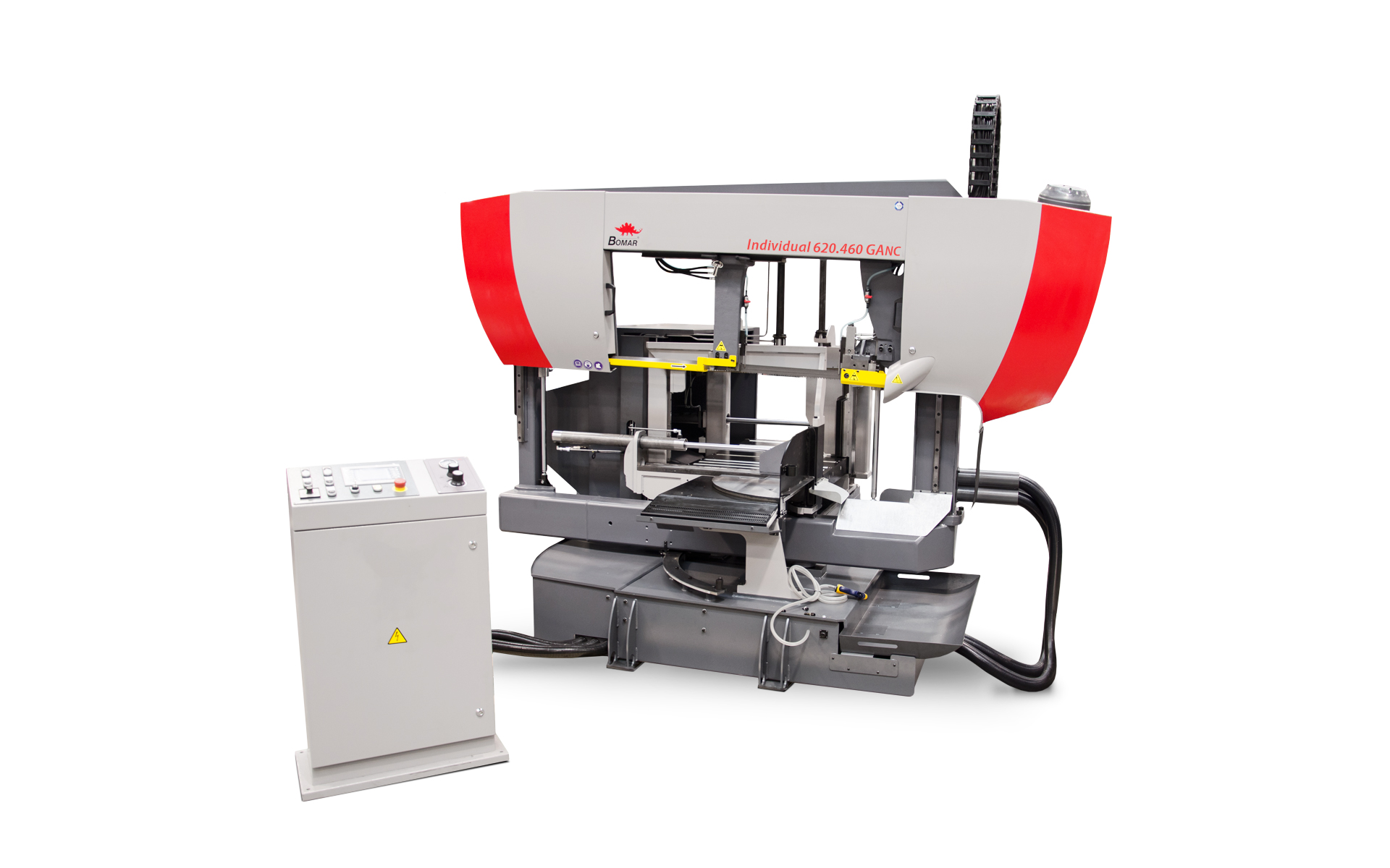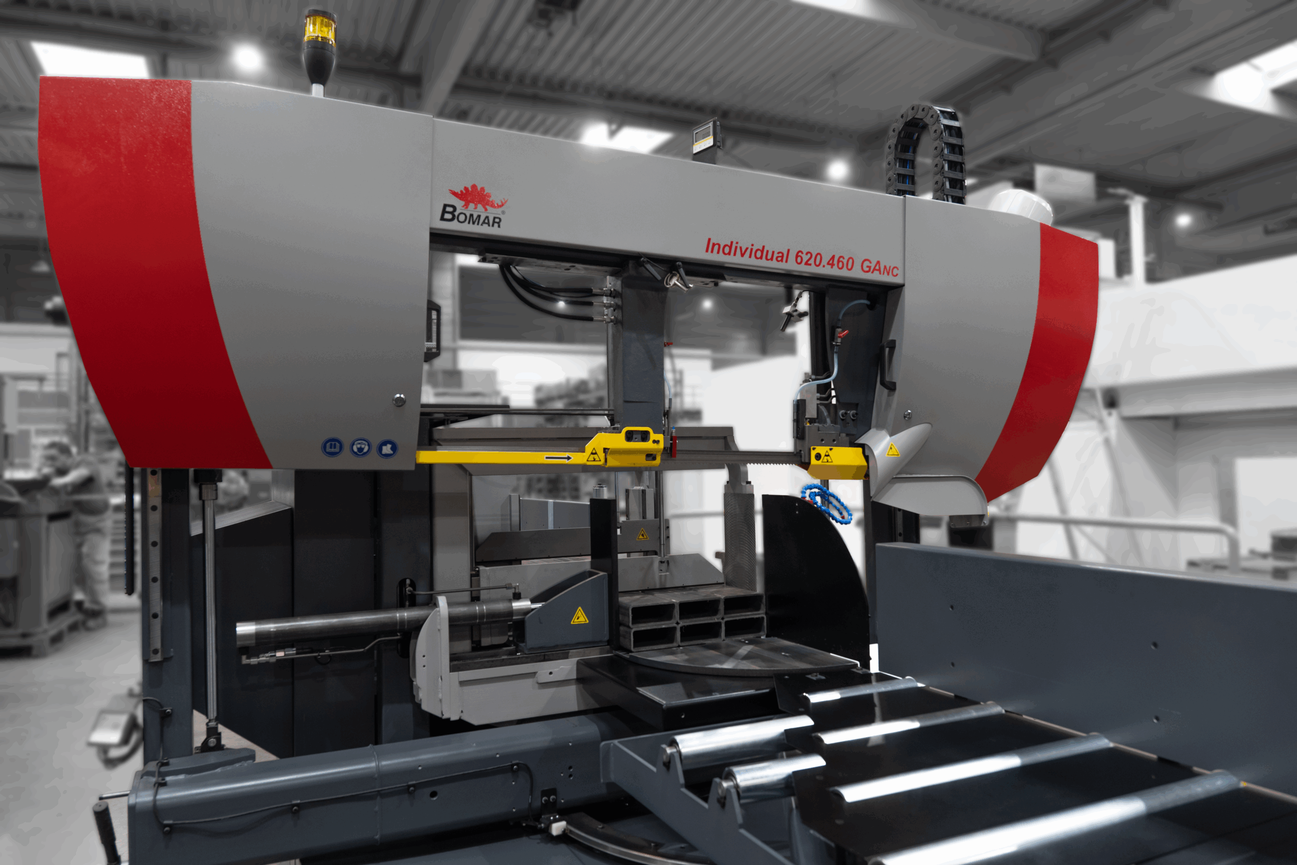 Individual 620.460 GANC to uniwersalna automatyczna piła taśmowa o konstrukcji dwukolumnowej, przeznaczona również do jednostronnych cięć ukośnych. Dzięki sztywności ramion, dwukolumnowe piły taśmowe z obustronnym prowadzeniem liniowym osiągają znacznie krótsze czasy cięcia, zwłaszcza przy cięciu pełnych materiałów, niż maszyny z przegubowymi ramionami piły. Wyjątkowa moc cięcia maszyny wynika z następujących cech: trójstronnej precyzyjnej prowadnicy taśmy z węglika spiekanego, ramienia piły położonego obustronnie na prowadnicach liniowych, taśmy piły o wysokości 41 mm i wreszcie synchronicznie pracującej szczotki do usuwania wiórów.