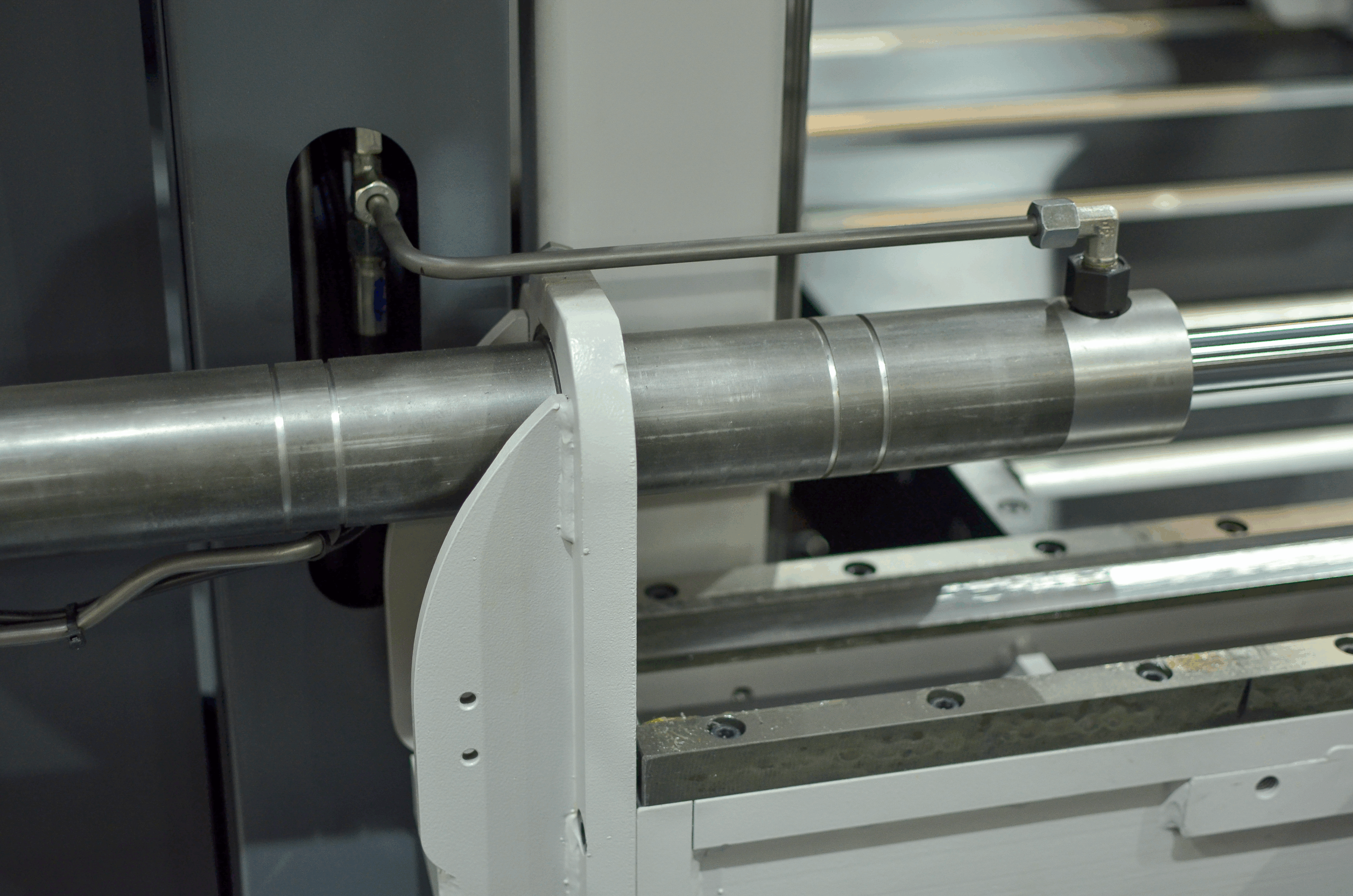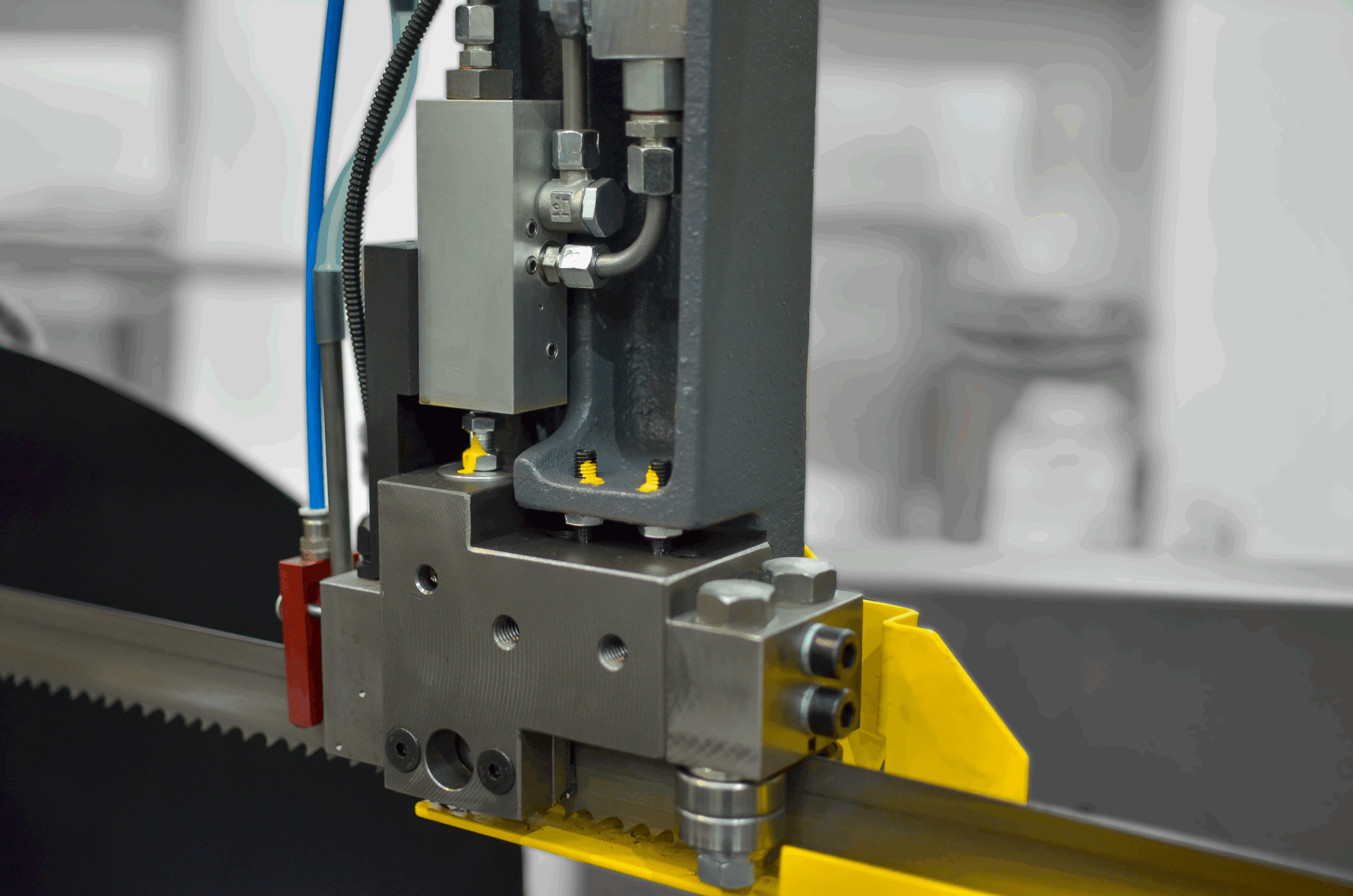 Podawanie materiału w dół, zaciskanie materiału i podawanie ramienia w dół są sterowane hydraulicznie. Maksymalna długość pojedynczego podawania wynosi 750 mm. Cały cykl roboczy jest zakończony po zaprogramowaniu długości i liczby elementów.