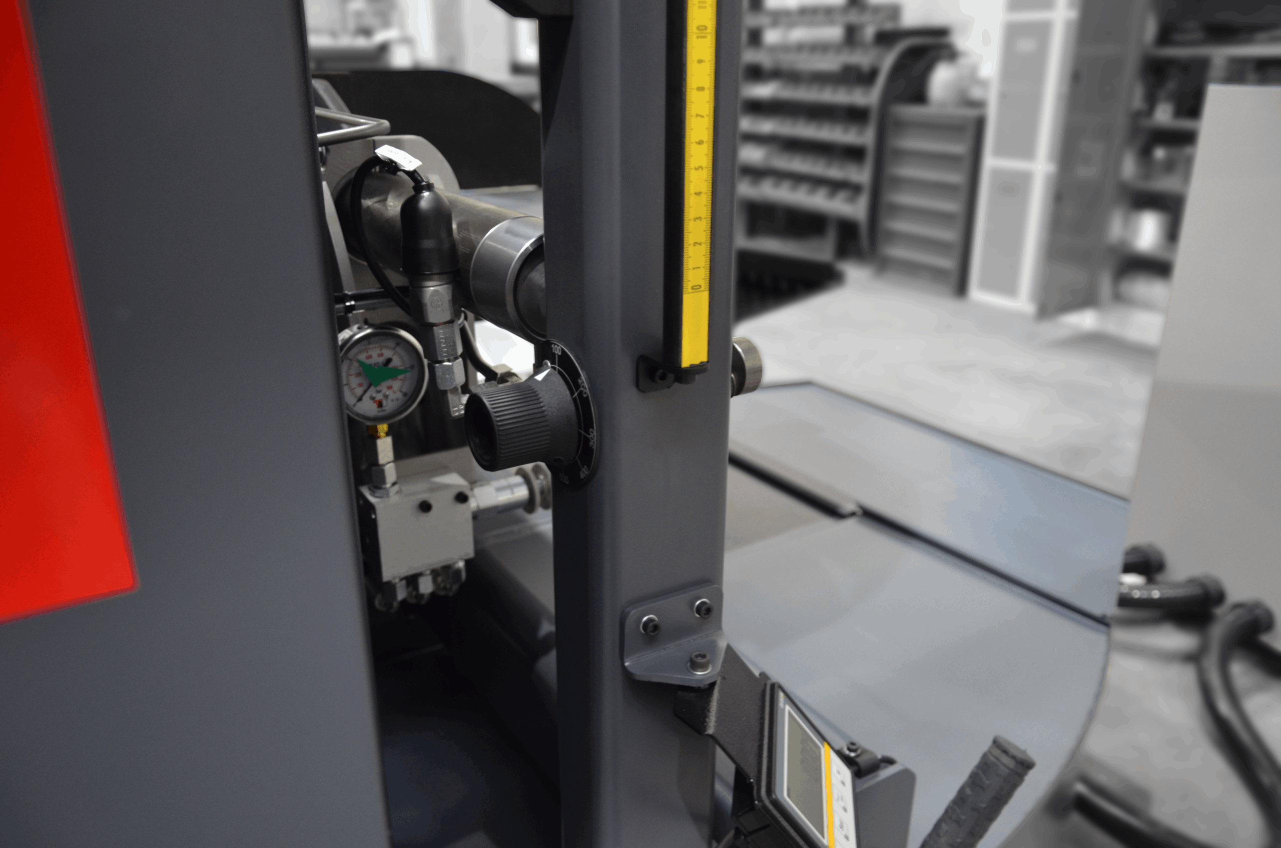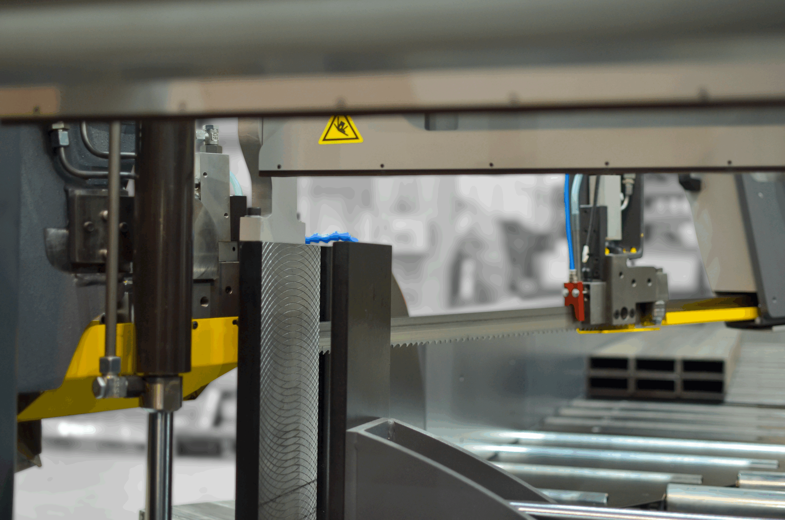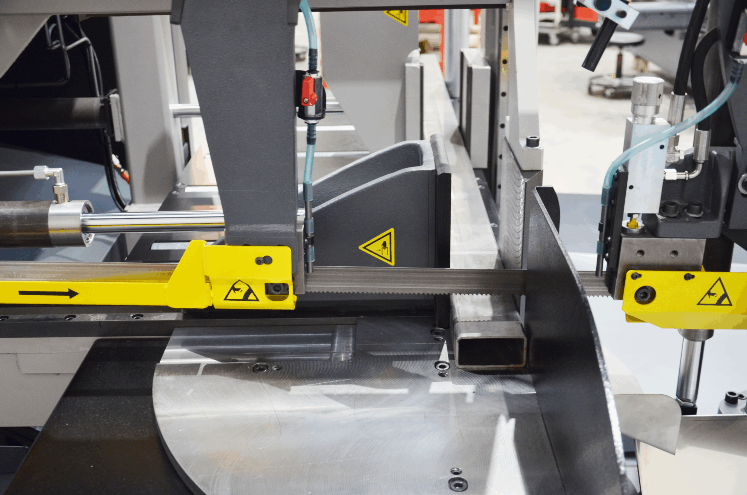 Zakres obrotu piły jest ciągły od 0° do 60°, dokładnie przy stabilnej pozycji zaciskanego materiału. Zaciskanie materiału odbywa się za pomocą imadeł o pełnym skoku. Maszyna jest wyposażona w przetwornicę częstotliwości, która umożliwia ustawienie optymalnej prędkości taśmy piły w stosunku do obrabianego materiału w zakresie 20–120 m/min; znacznie zwiększa to zarówno żywotność taśmy piły, jak i wydajność maszyny. Taśma piły jest pochylona względem powierzchni obciążenia imadła pod kątem 2°, co również znacznie skraca czas cięcia i przyczynia się do dłuższej żywotności taśmy piły.