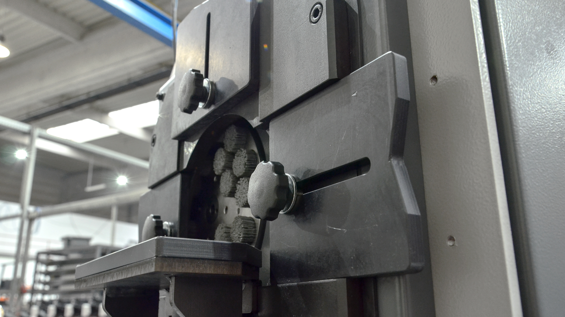 Materiał jest czyszczony za pomocą specjalnej tarczy zamocowanej do osi wału w zamkniętej przestrzeni. Materiał, spoczywający na stole, jest podawany na tarczę przez boczny otwór.