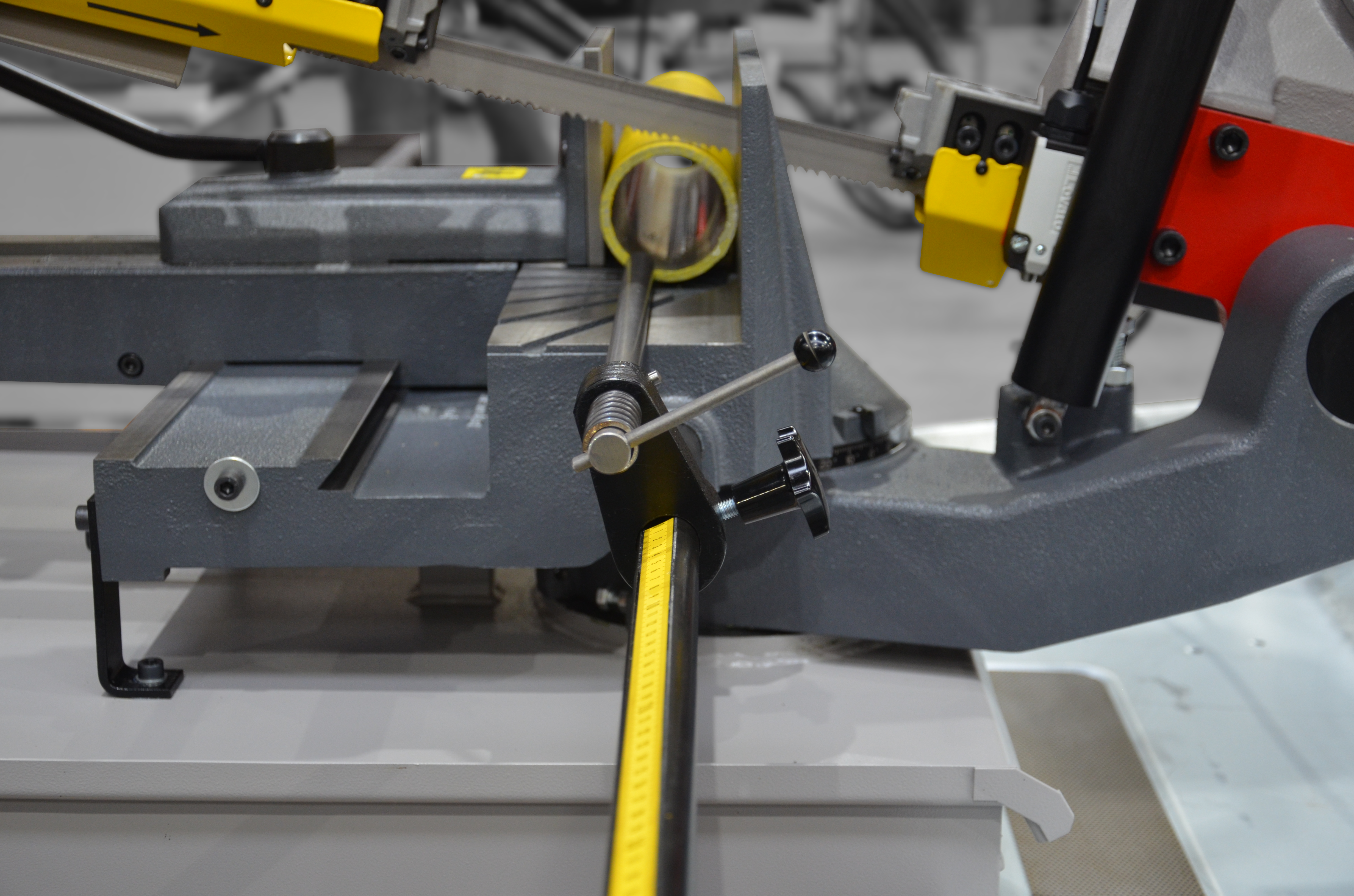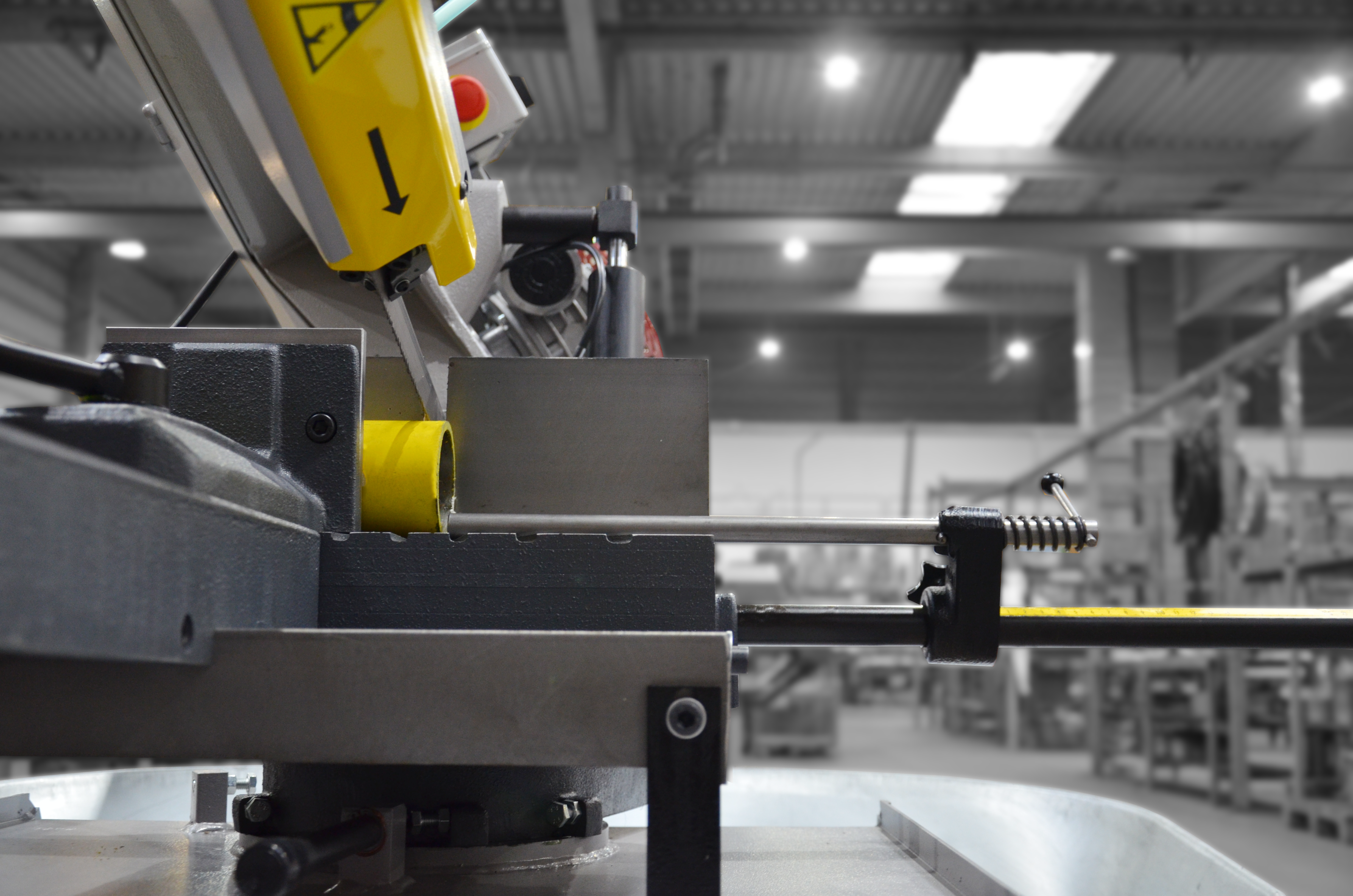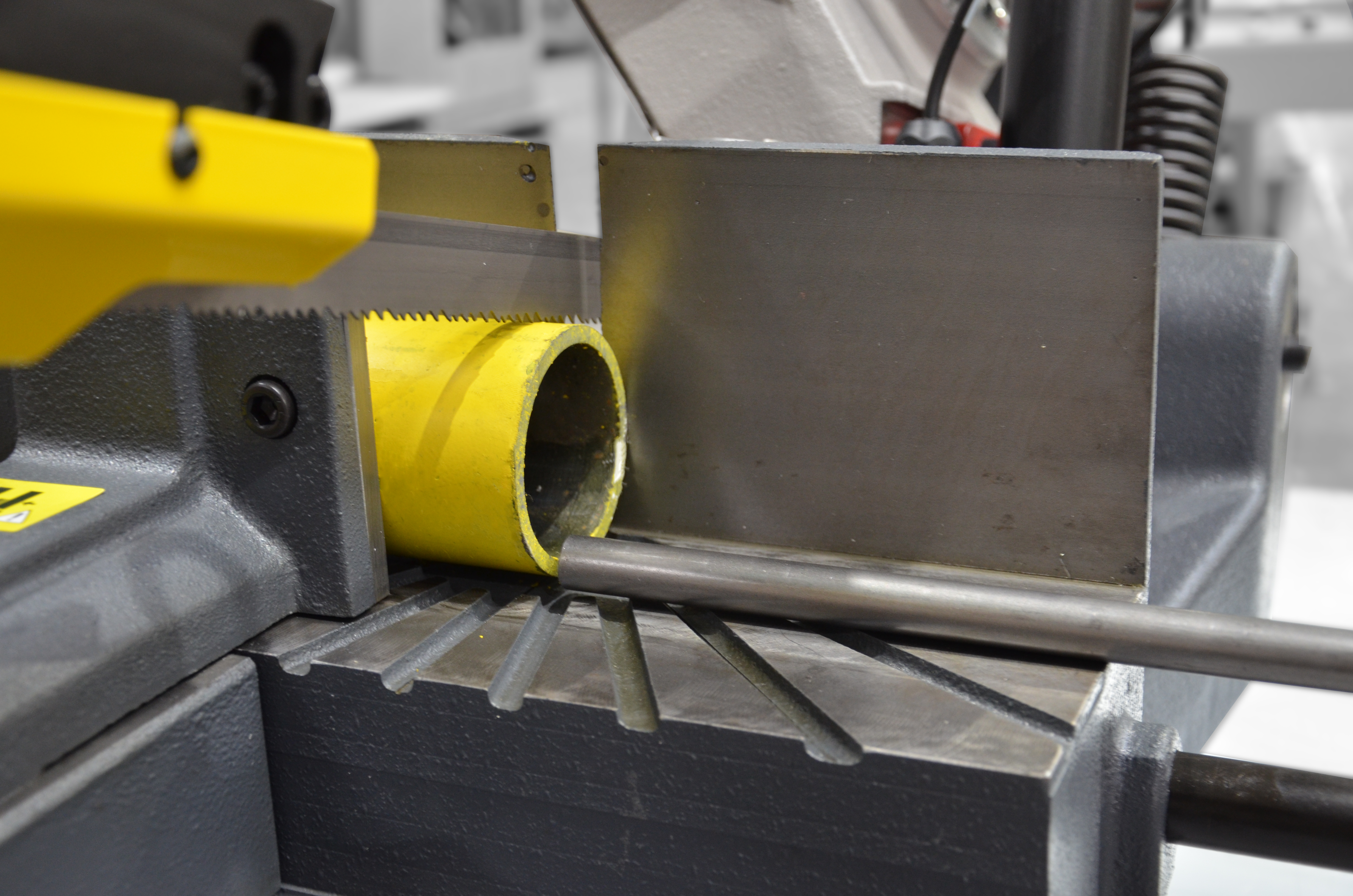 Wyposażenie standardowe składa się z regulowanego ogranicznika długości (zderzaka). Napęd taśmy piły stanowi dwubiegowy silnik fabryczny oraz przekładnia ślimakowa pracująca w kąpieli olejowej. Prędkość przesuwu taśmy wynosi od 40 m/min do 80 m/min przy stałym położeniu zamocowanego materiału.