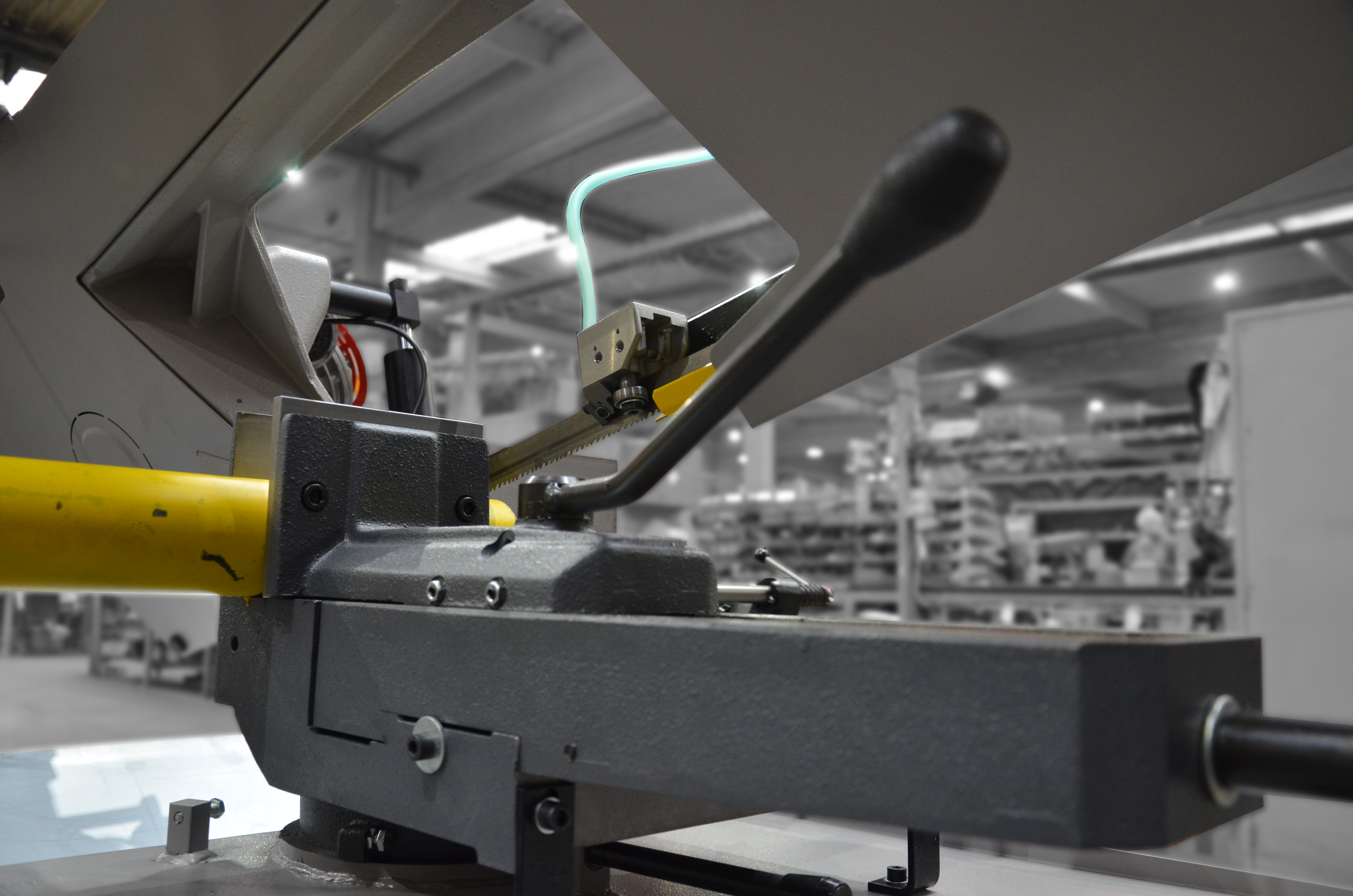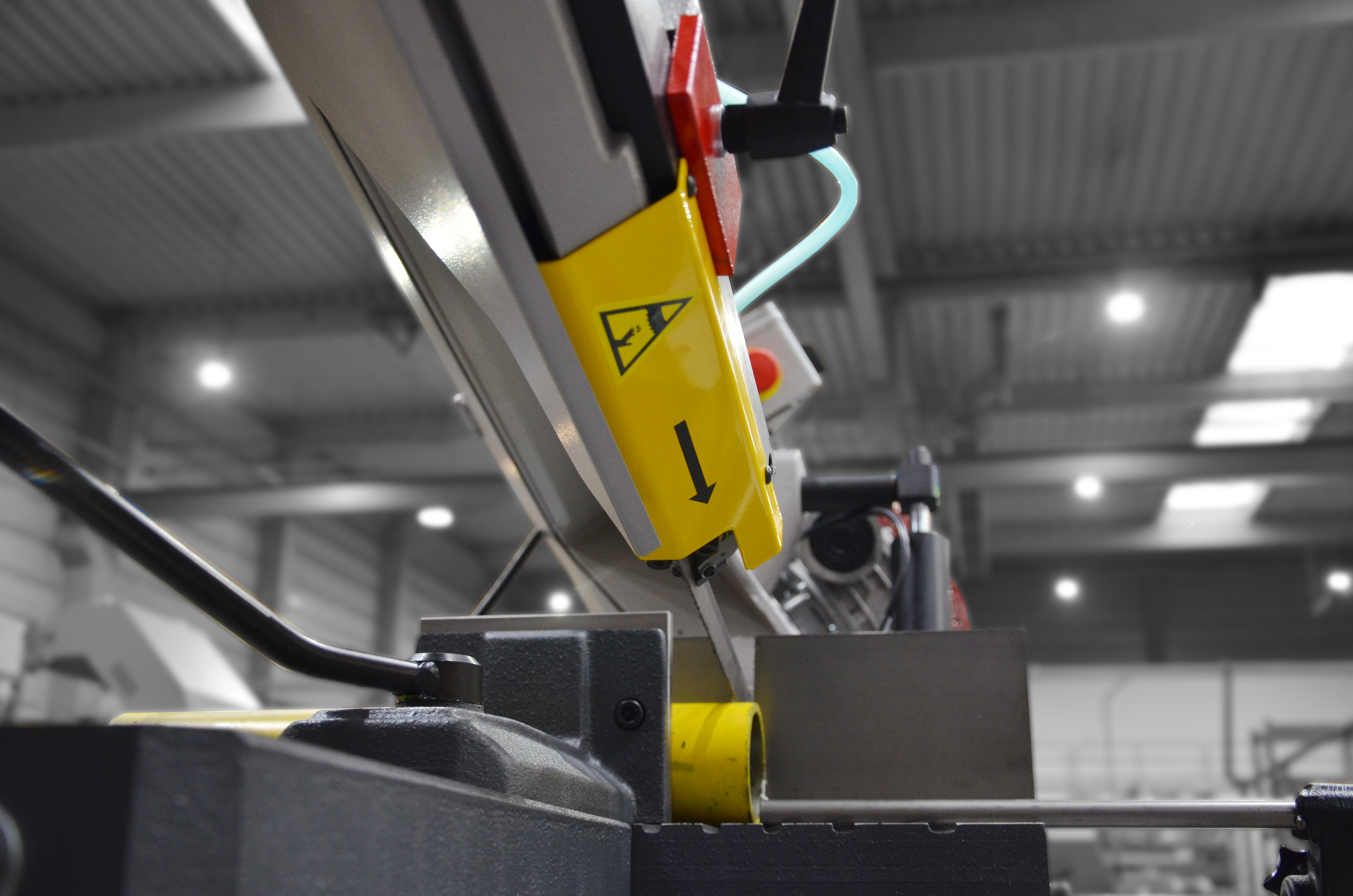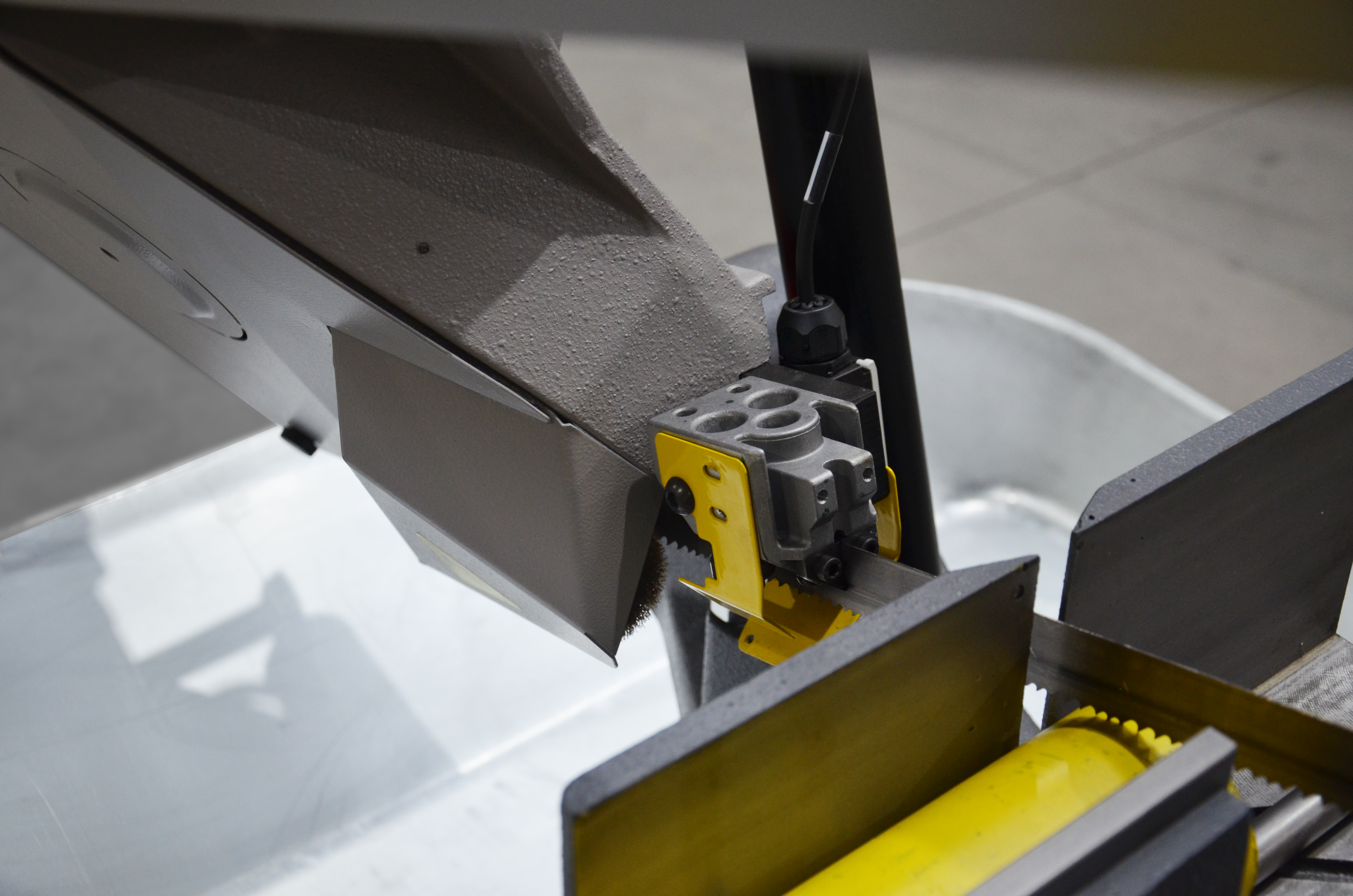 Opuszczanie (obniżanie) ramienia jest zapewnione poprzez ciężar własny ramienia. Prędkość opuszczania (opadania) jest regulowana przez siłownik hydrauliczny za pomocą zaworu przepływowego. Po zakończeniu operacji cięcia materiału następuje ręczne podniesienie ramienia piły.