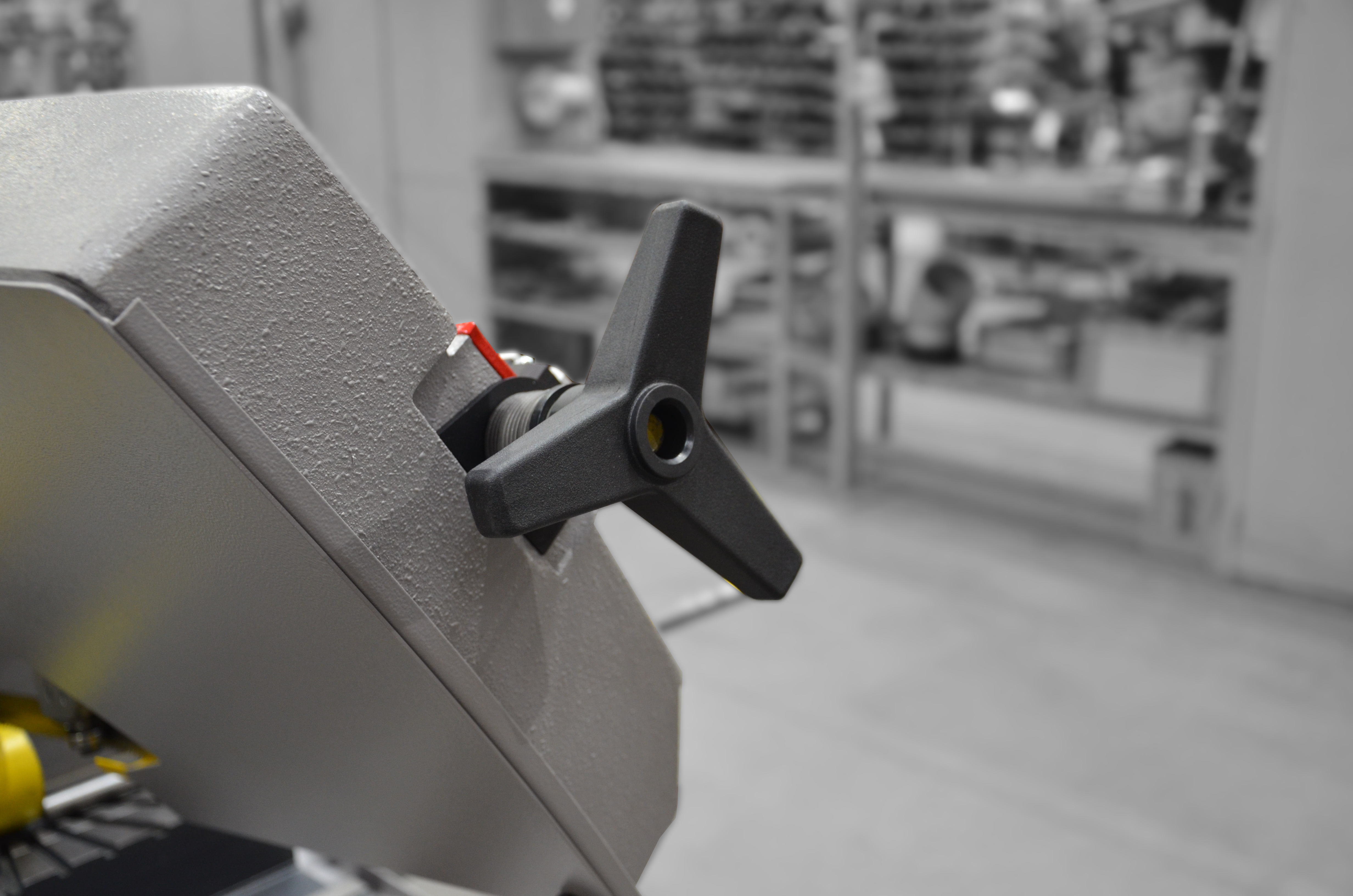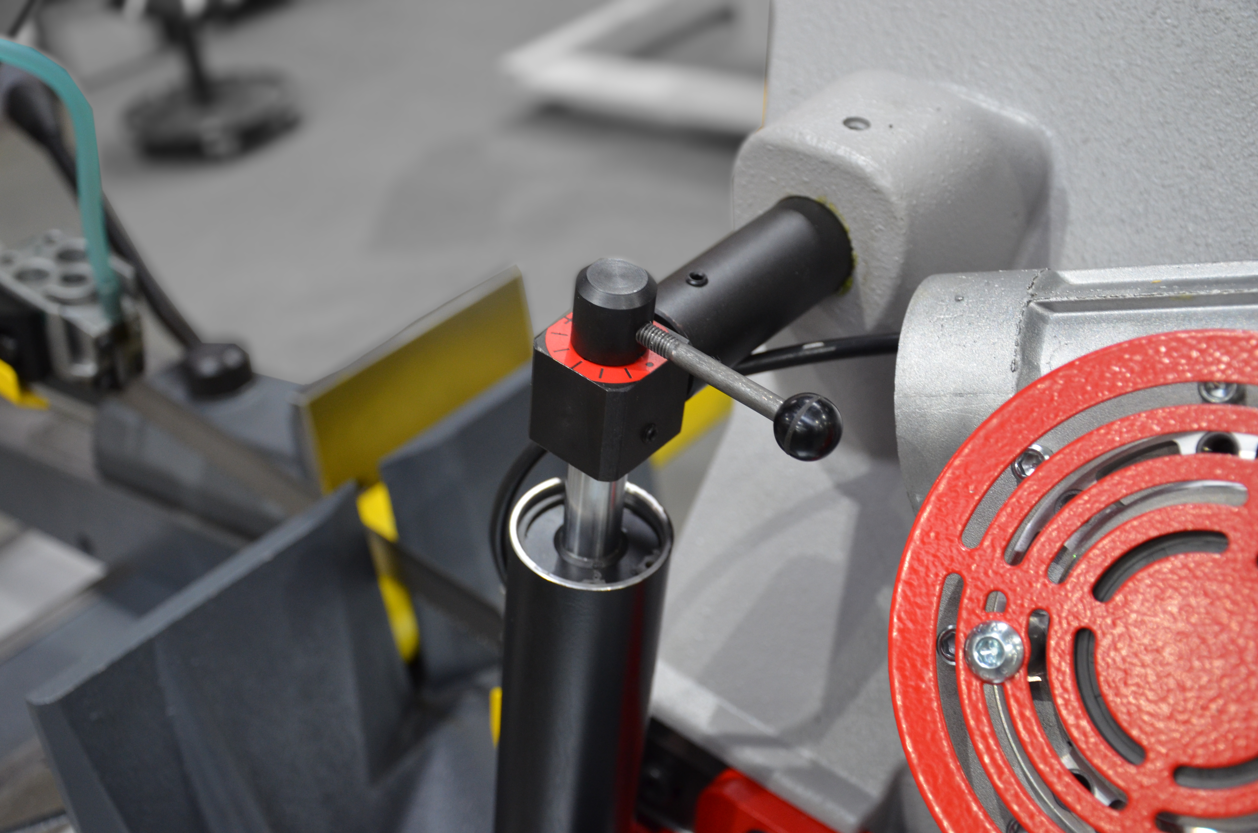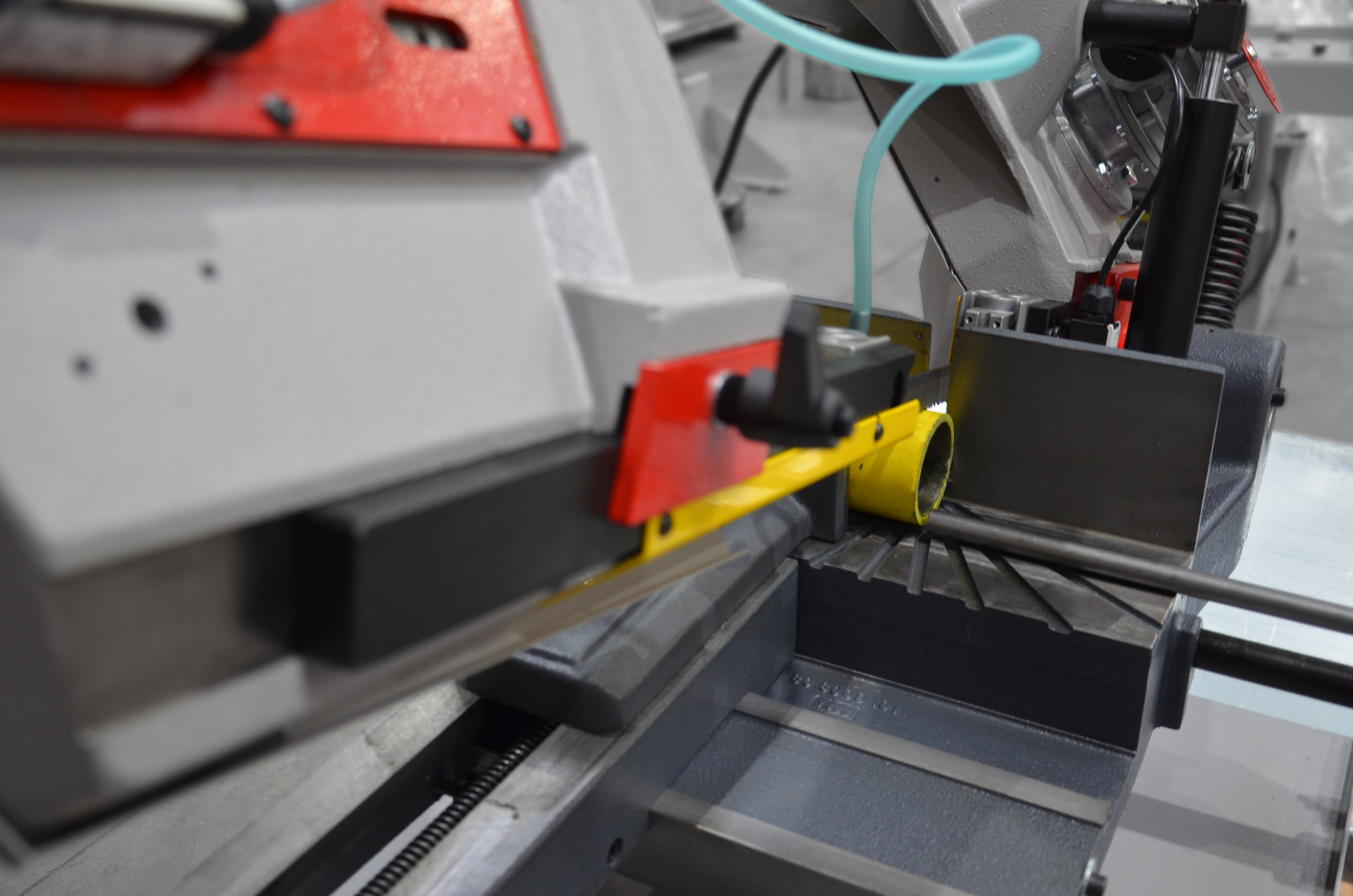 Opuszczanie (obniżanie) ramienia jest zapewnione poprzez ciężar własny ramienia. Prędkość opuszczania (opadania) jest regulowana przez siłownik hydrauliczny za pomocą zaworu przepływowego. Po zakończeniu operacji cięcia materiału następuje ręczne podniesienie ramienia piły.