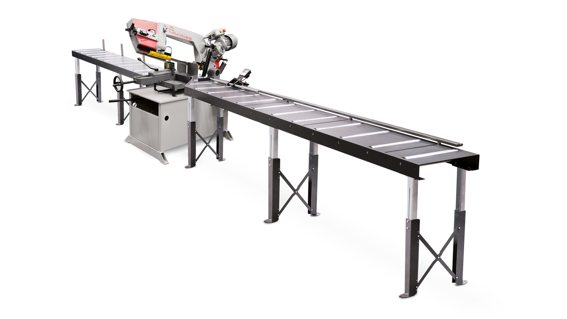 Przecinarka taśmowa Proficut 275.230 DG może być rozbudowana poprzez zamontowanie przenośników rolkowych podłączonych zarówno do wsadu jak i odbioru materiału. Dostępny jest szeroki zakres akcesoriów, takich jak chłodzenie i smarowanie za pomocą mgły olejowej (Micronizer), laserowa linia cięcia, lampy halogenowe dla przestrzeni roboczych, pistolet czyszczący do usuwania opiłków oraz przyrząd do pomiaru napięcia brzeszczotu(Tenzomat).