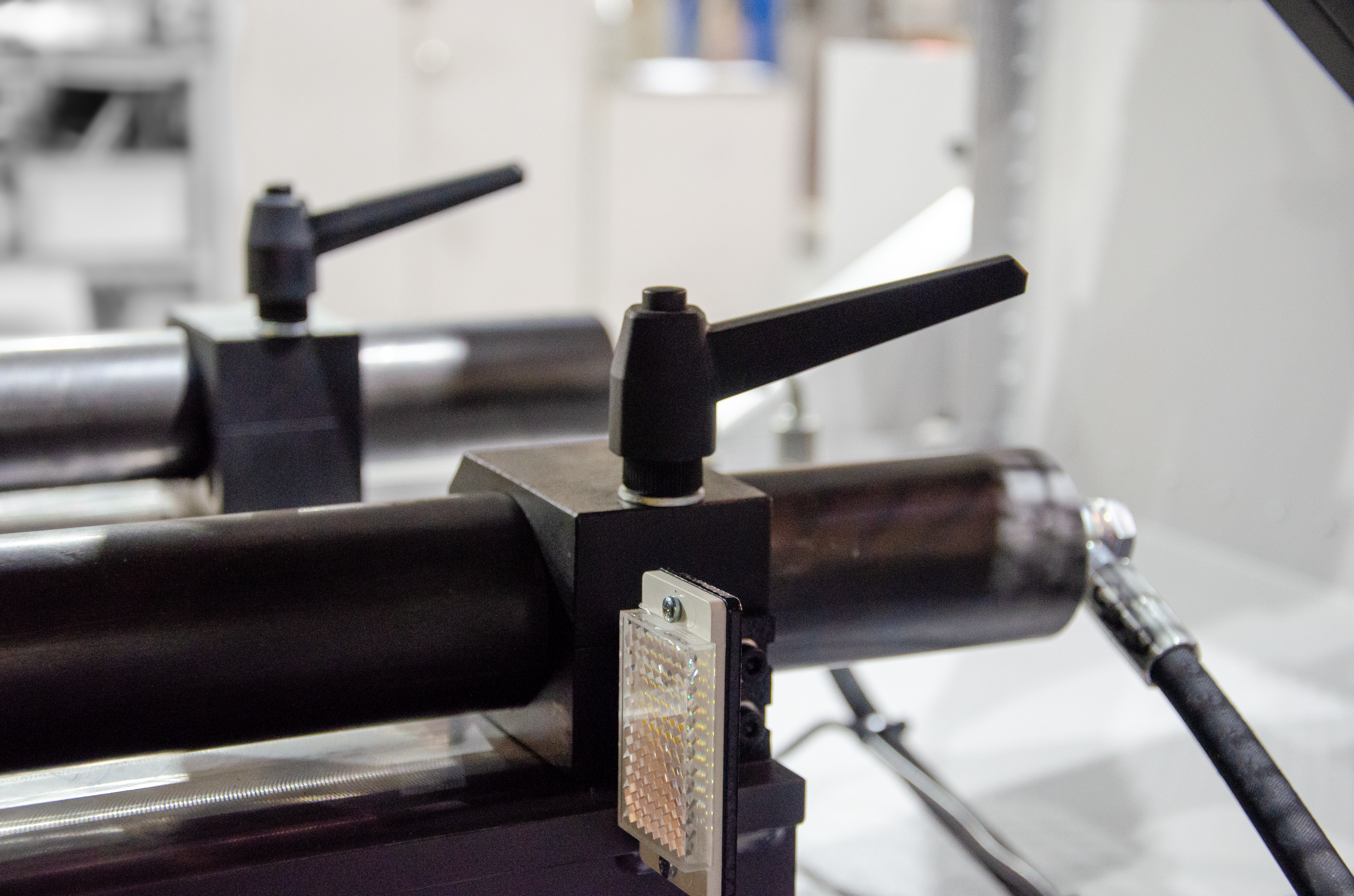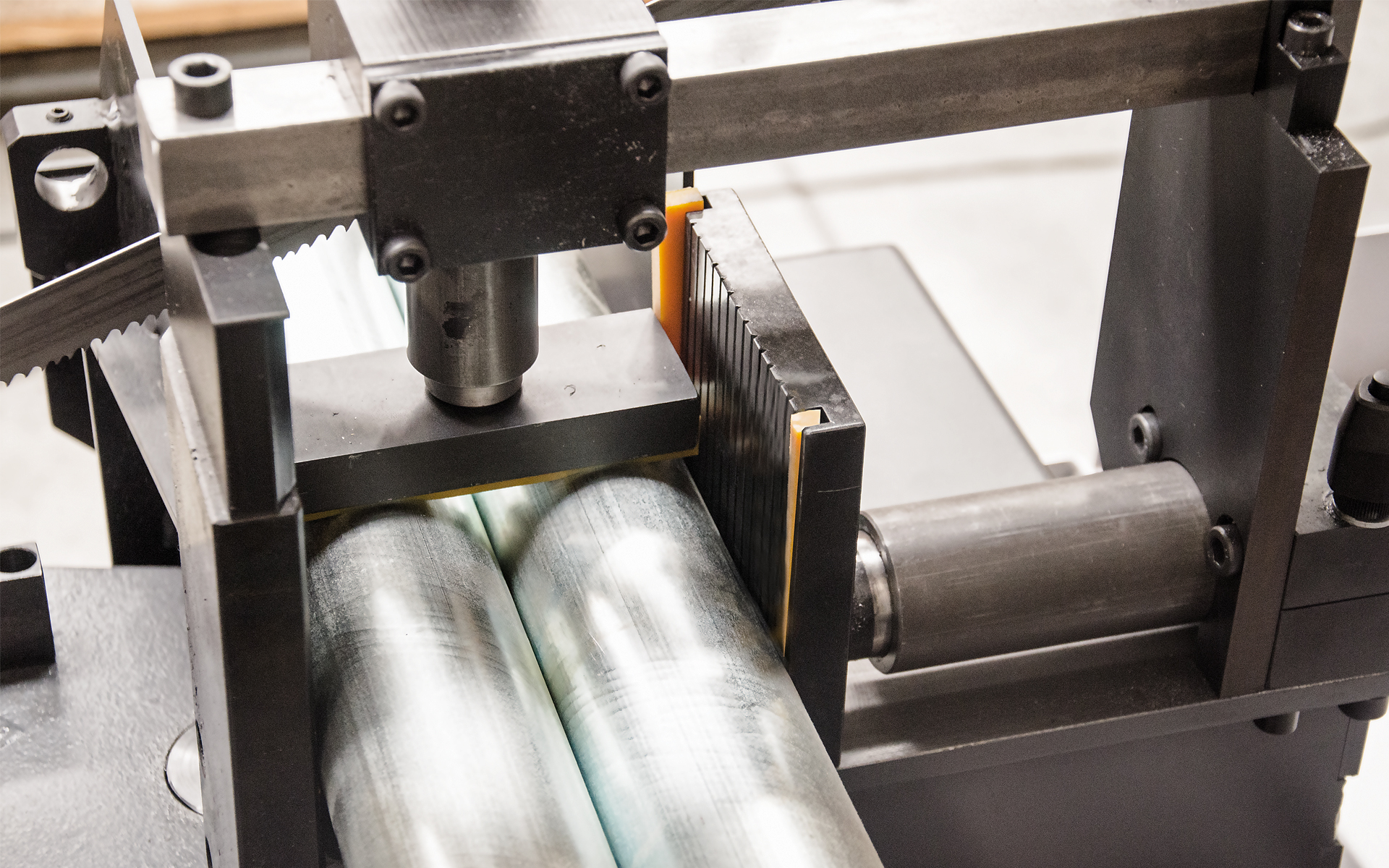 Układ wsadowy jest otwarty po obu stronach, co eliminuje kolizje z nierównymi materiałami. Podstawowa wersja maszyny oferuje dwie prędkości cięcia: 40 i 80 m/min.