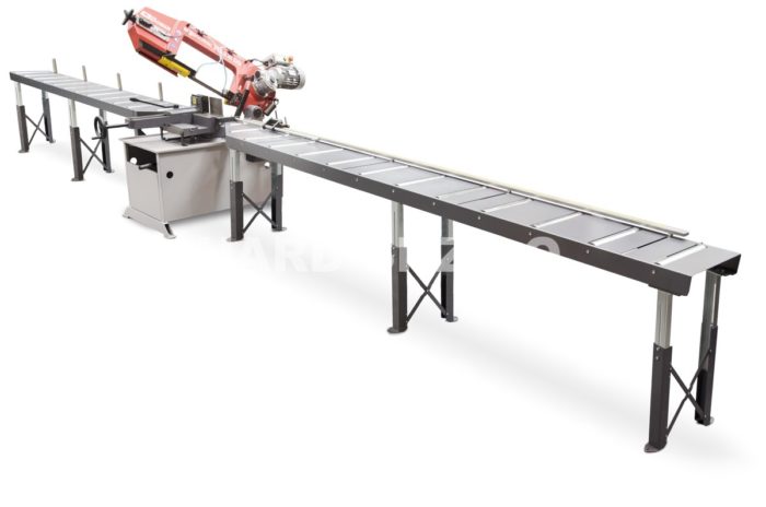 Wyposażenie standardowe składa się z regulowanego ogranicznika długości (zderzaka). Napęd taśmy piły stanowi dwubiegowy silnik fabryczny oraz przekładnia ślimakowa pracująca w kąpieli olejowej. Prędkość przesuwu taśmy wynosi od 40 m/min do 80 m/min przy stałym położeniu zamocowanego materiału.
