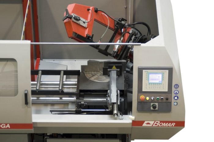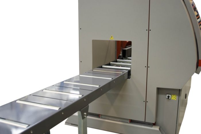 W pełni automatyczna piła taśmowa do obustronnego cięcia po skosie z automatycznym ustawieniem pozycji ramienia. Wsad materiału, mocowanie materiału oraz opuszczanie ramienia odbywa się hydraulicznie.